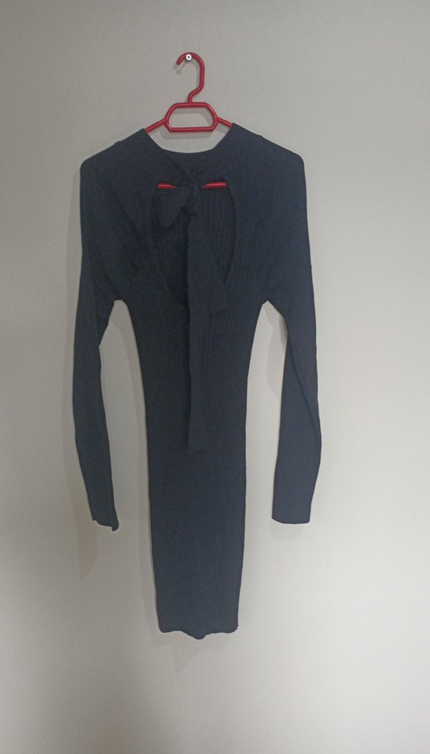 Kadınlar için v yaka, uzun kollu, kemerli, sentetik kumaştan yapılmış dar kesim koyu gri triko elbise. Minimalist gotik tarzda, dış mekan kullanımı için uygundur.