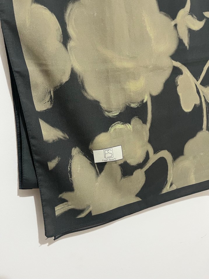 Koyu haki renkli, ipek dokulu, çağdaş çiçek desenli ve drapeli kadın şalı, Paris tarzı için uygun.