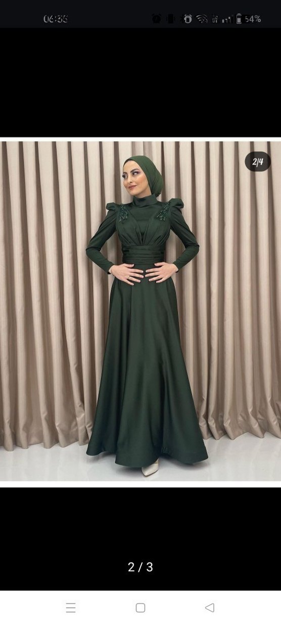 Koyu haki renkte, yüksek yakalı ve uzun kollu işlemeli uzun abiye elbise. Drapeli tasarım ve düzenli kesimle, mütevazı ve gösterişli tarza uygun, düğün için ideal. şalı ile satılık 1 kere kardeşimin nişanında giydim harika bir kumaşa sahip 40 beden ama 38 bedene daha güzel olur