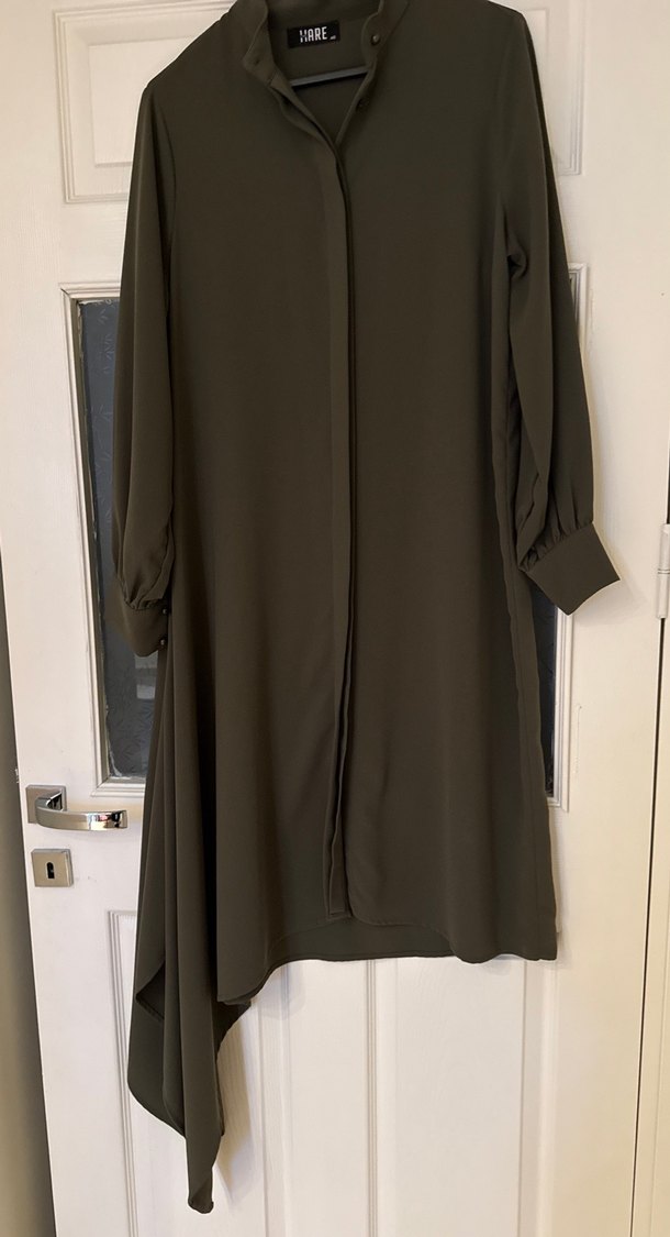 Kadınlar için koyu haki renkte, uzun kollu ve tunikbol kesim ve çok şık tunik bir tarafı uzun