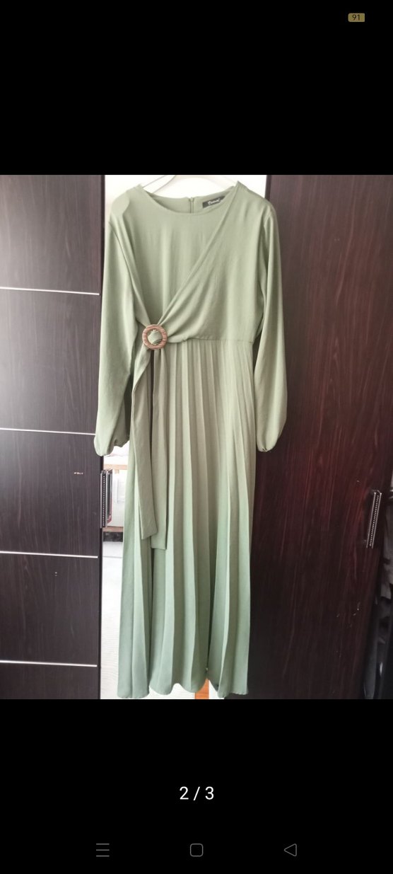 Kadınlar için uzun, koyu haki renkte, uzun kollu ve yuvarlak yakalı pilili elbise. Sentetik kumaştan, kemerli ve bol kesimdir. Düğünler ve modern klasik tarz için uygundur.