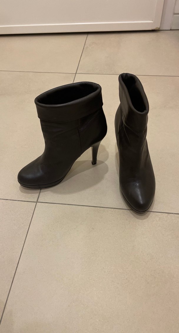 Kahverengi deri kadın botları, şık stiletto topuk ve tokalı detay ile klasik ve zarif ofis stiline uygundur. Sadece topuk lastiği yenilense iyi olur.