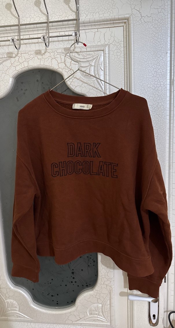 Koyu kahverengi kumaştan, uzun kollu ve bisiklet yaka kadın sweatshirt. 'DARK CHOCOLATE' baskılı, rahat ve şık sokak stili sunar.