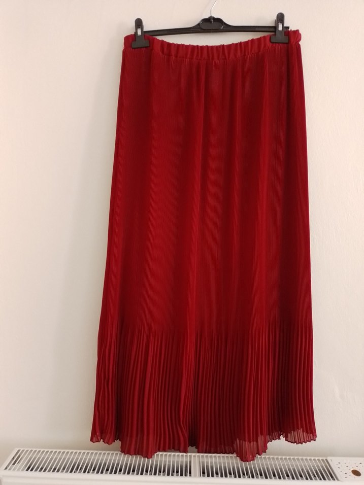 Kadınlar için uzun, bol kesim pilili etek. Parlak kırmızı sentetik kumaştan, romantik akşamlar için uygun. 48 bedene kadar olur beli lastikli oldugu için standart astarlıdır çok şık hem günlük hem özel günler de giyilir
