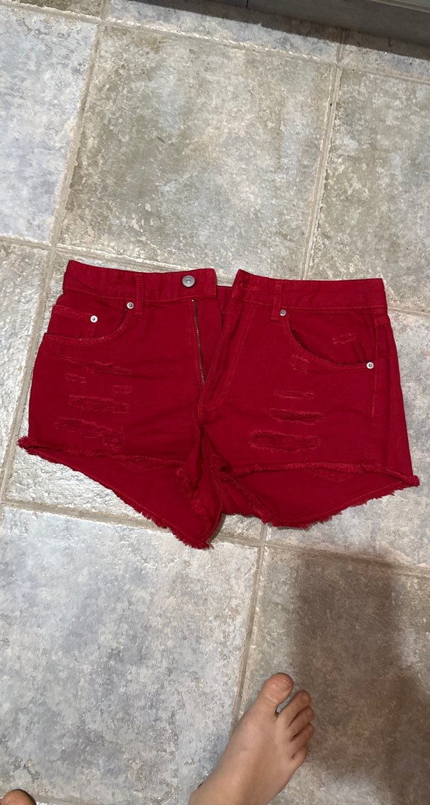 Koyu kırmızı, yıpratılmış detaylara sahip dar kesim mini denim şort. Cesur, grunge punk sokak stili için romantik buluşmalarda şık ve rahat.