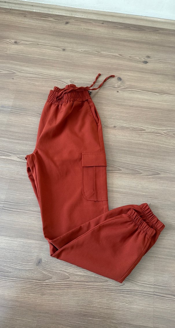 Kadınlar için koyu kırmızı, rahat kesim midi uzunlukta kumaş pantolon. Sentetik kumaştan üretilmiş, günlük kullanıma uygun, zahmetsiz şıklık sunar. Lastikli krep kumaş yeni kiremit renk