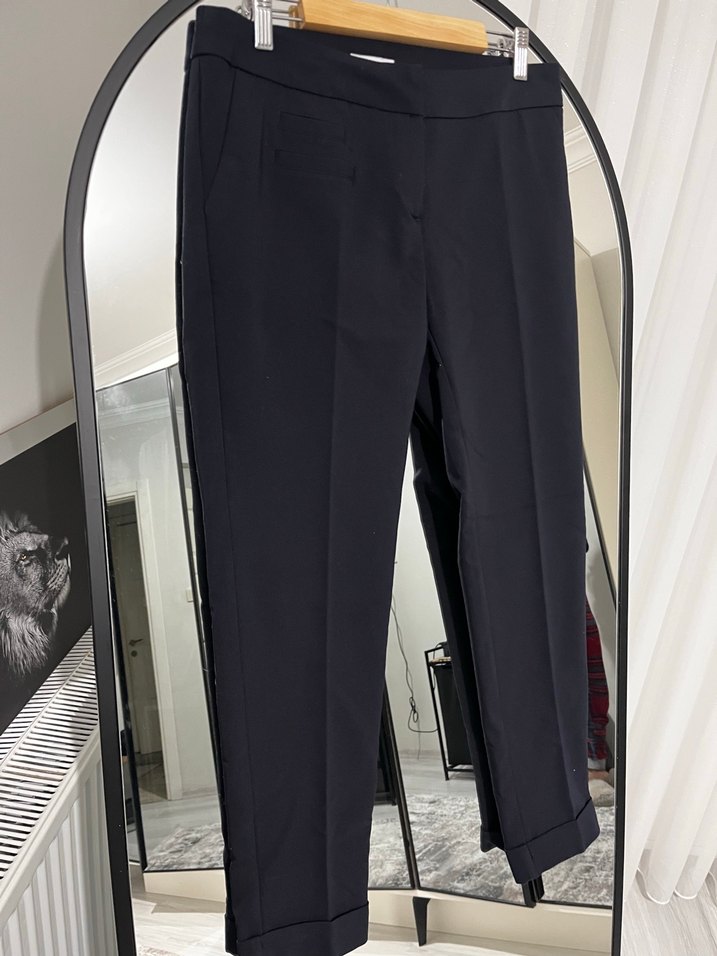 Lacivert kumaş pantolon, regular fit ve pilili tasarıma sahiptir. Sentetik kumaştan yapılmış, midi boy ve ofise uygun çağdaş tarzda.