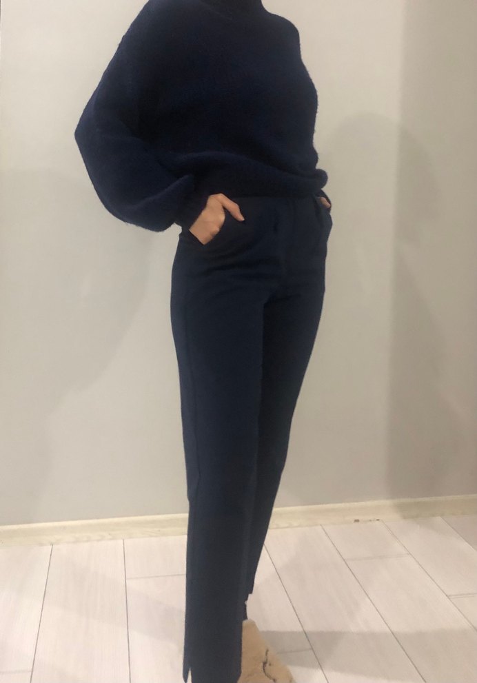 Koyu Larcivert renkte, normal kesim ve midi boyda kumaş pantolon, ofis ve günlük kullanım için zahmetsiz şıklık sunar. ✨