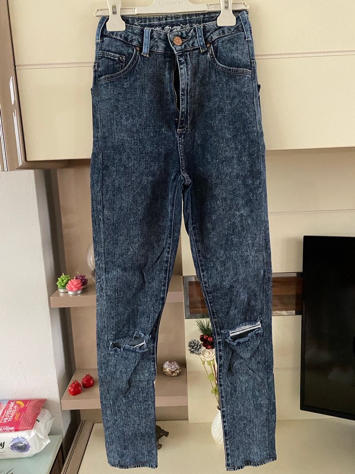 Koyu mavi batik desenli, dar kesim, kemerli kadın jean. Orta boy midi uzunlukta ve yırtık diz detaylı, günlük sokak stili için uygundur.