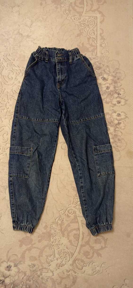 Koyu mavi renkve bol kesim kadın denim pantolon. Midi boy, elastik bilek detaylı, günlük rahat kullanıma uygun.