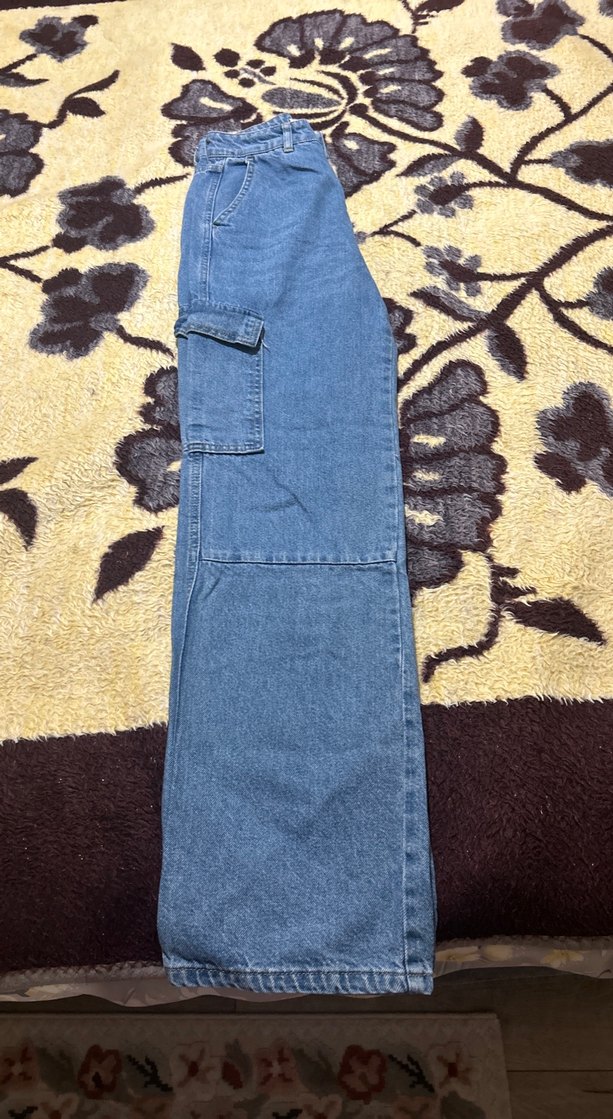 Koyu mavi bol kesim kadın kot pantolon, kemerli ve batik desenli, günlük rahat sokak stili için uygundur.