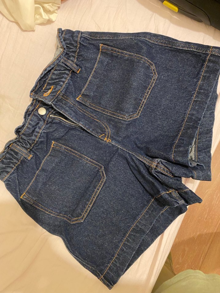 Koyu mavi kot şort, bol kesim ve kemer detaylı, mini boyda, sade tasarımlı, günlük sokak stiline uygun. (Marka ve bedenden emin değilim)