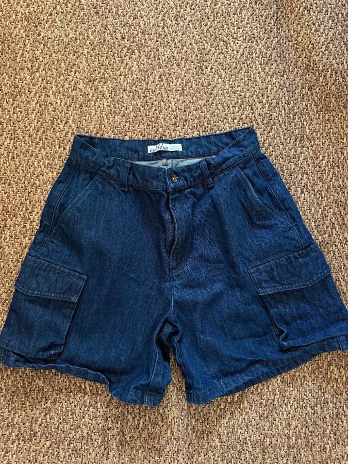 Kadınlar için koyu mavi tonlarında, bol kesim ve mini boyda denim şort. Rahat ve şık sokak stili için uygun, outdoor kullanıma ideal.