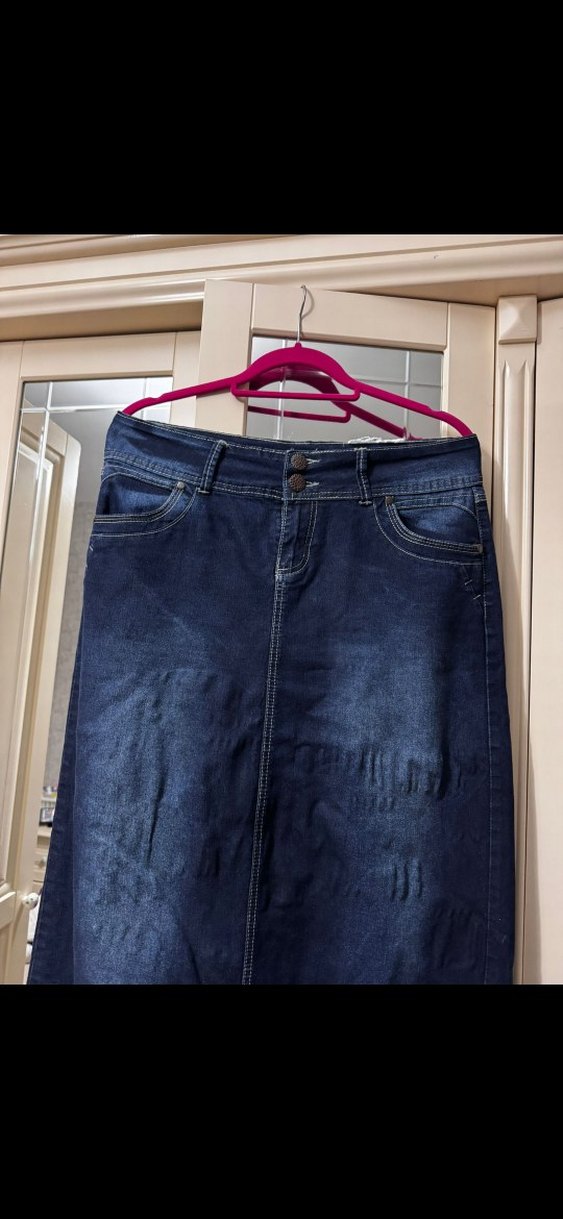 Koyu mavi denim etek, dar kesim ve tokalı detaylı, gündelik ve sokak stili için uygundur .