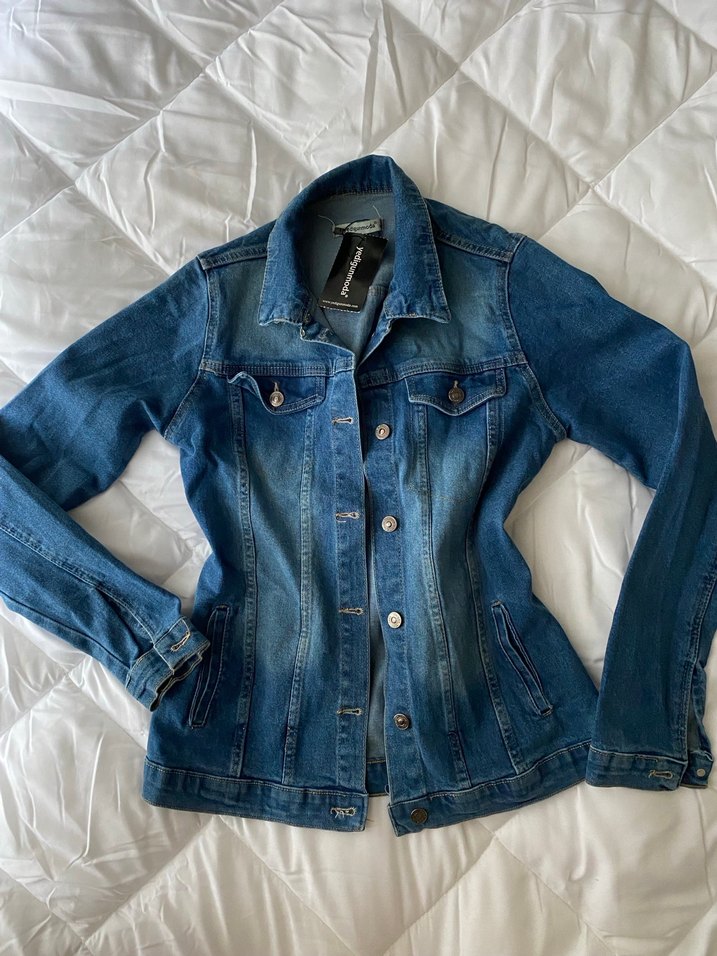 Düğmeli ve uzun kollu, koyu mavi renkli, kadınlara özel dar kesim denim ceket. Günlük ve rahat sokak stiline uygun.