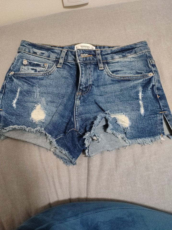 Düğmeli önü ve yıpranmış detaylarıyla, koyu mavi, mini uzunlukta ve dar kesim kadın denim şort. Rahat ve trend sokak stili için uygundur.