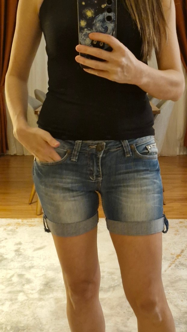 Koyu mavi renkte, kemerli ve kısa kesim kadın denim şort. Günlük kullanıma uygun, rahat ve şık bir sokak stili parçası.