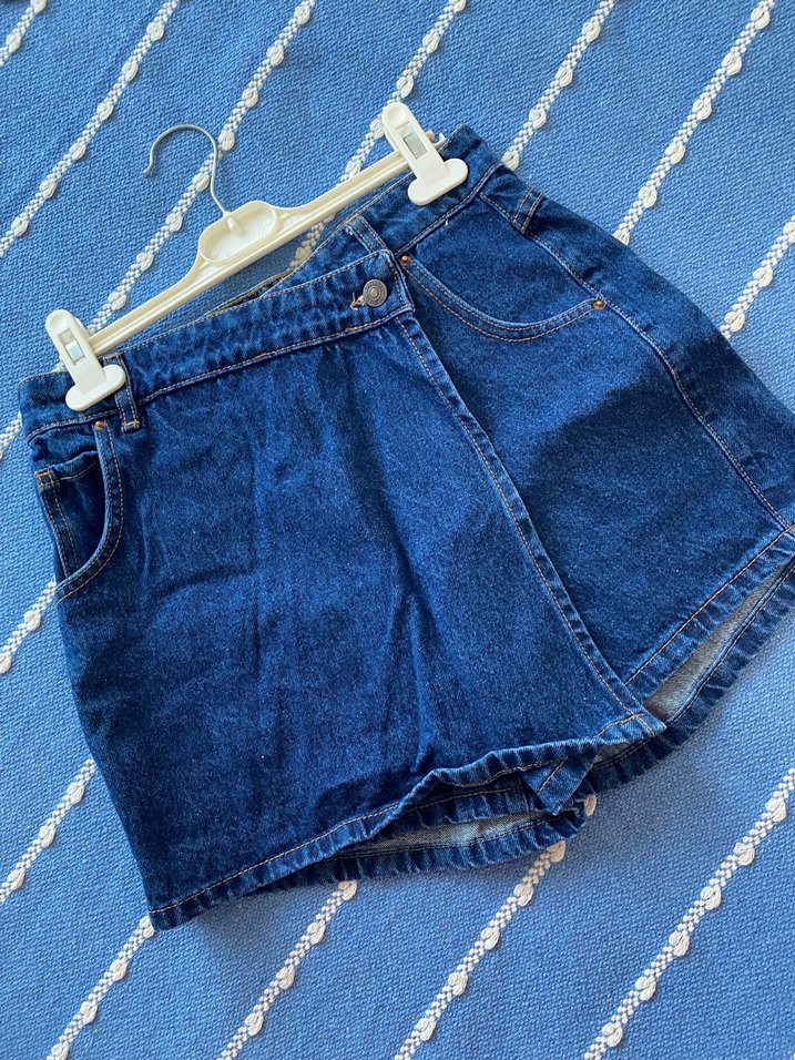 Kadınlar için koyu mavi kot şort, bol kesim ve kemerli tasarıma sahiptir. Mini boy ve sade stili günlük kullanım için uygundur. Belime dar olduğundan hiç giyilmedi