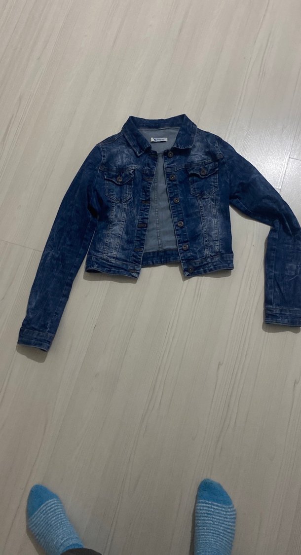Kadınlar için fitted kesim, düğmeli, uzun kollu, koyu mavi kısa denim ceket. Notlu yaka ve desen içermeyen tasarıma sahip, günlük sokak stili için uygun. M beden fakat dar kesim 38e uyumlu.