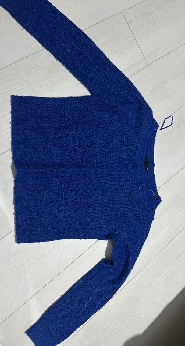 Kadınlar için koyu mavi, kısa boy, yuvarlak yakalı, uzun kollu ve ince triko kumaştan yapılmış dar kesim kazak.
