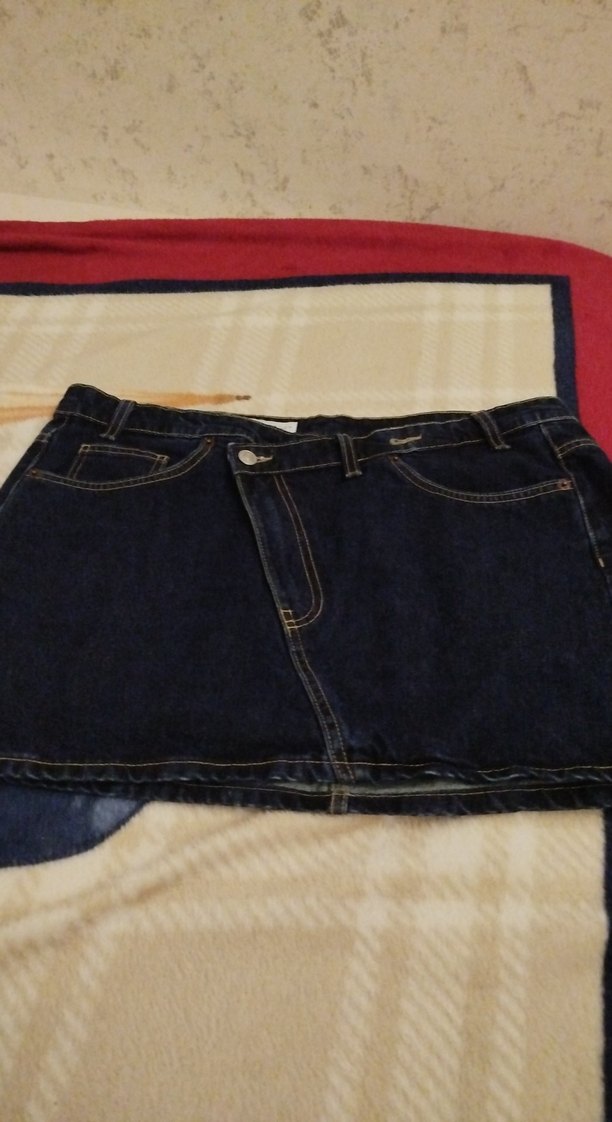 Koyu mavi renkli, kot kumaştan yapılmış, belinde tokası bulunan, normal boyda ve dar kesim kadın mini etek.