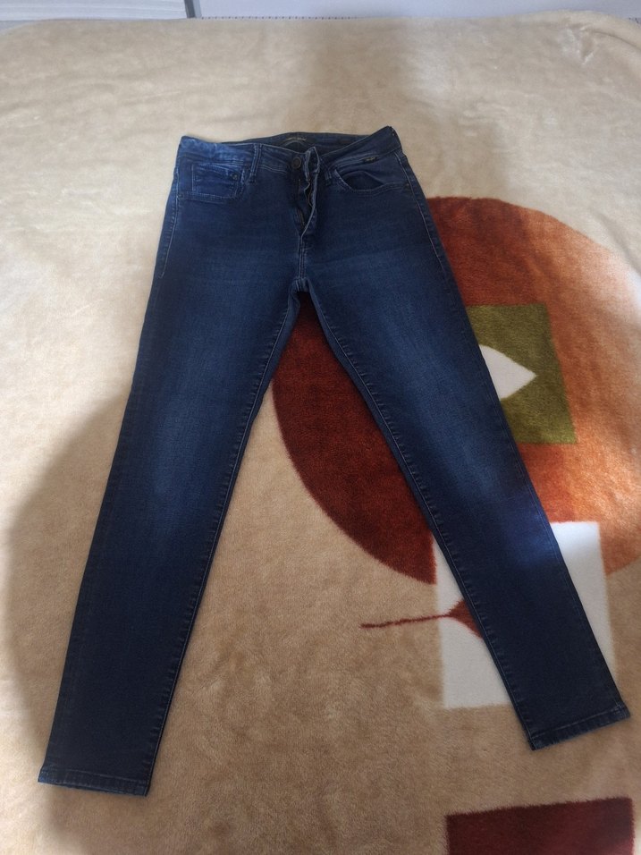 Kadınlar için koyu mavi denim kot pantolon, normal boy ve rahat kesime sahip. Günlük kullanıma uygun, tokalı detaylı sokak stili pantolon.
