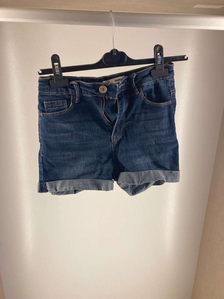 Koyu mavi kot şortlar, bol kesim ve tokalı detaylara sahiptir. Kısa boyu ve kıvrımlı paçalarıyla gündelik rahatlık sunar.