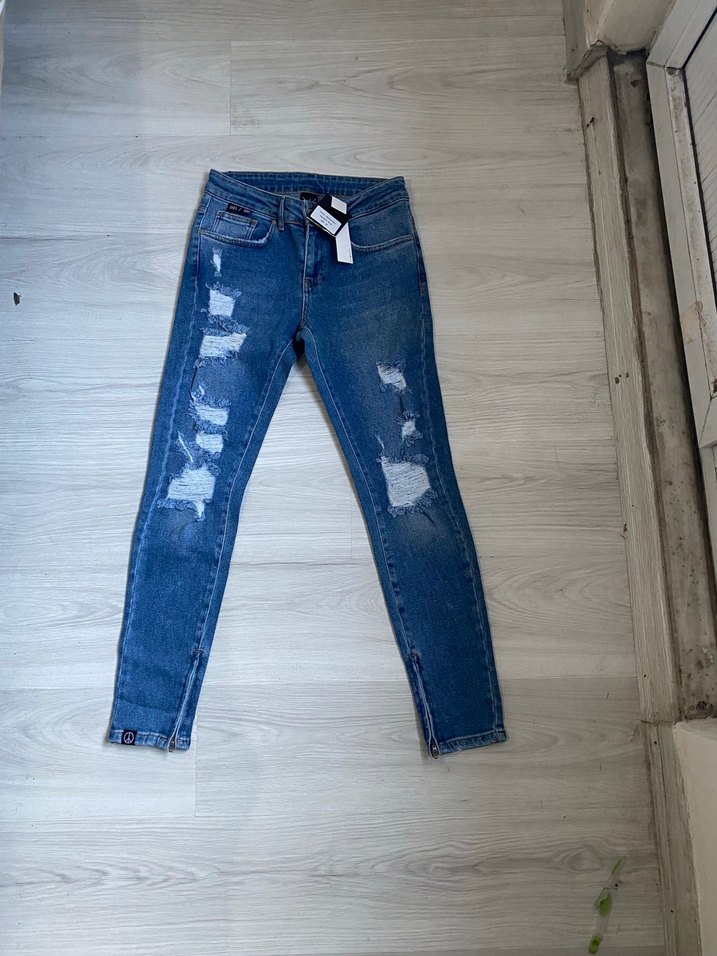 Koyu mavi renkte, sıkı kesim ve yırtık detaylı denim pantolon. Midi boy ve tokalı, günlük rahat kullanıma uygun.