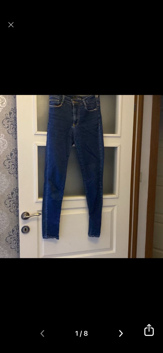 Kadınlar için koyu mavi, slim fit, midi boy kot pantolon, tokalı detaylı, günlük rahat kullanıma uygun. kullandım leke sökük yok renk atması yok esnek xs/siçin uygun