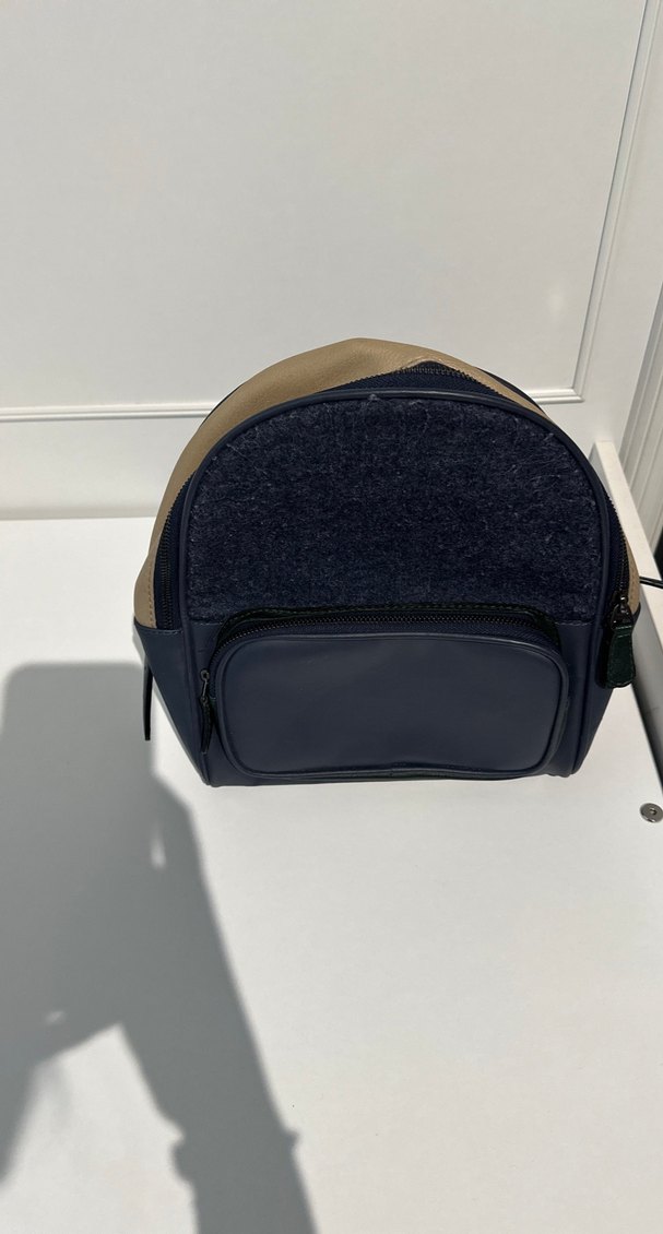 Koyu mavi süet malzemeden yapılmış, tokalı detaylı, minimalist ve sade tarzda günlük kullanıma uygun sırt çantası. Önünde küçük bir cep bulunur.