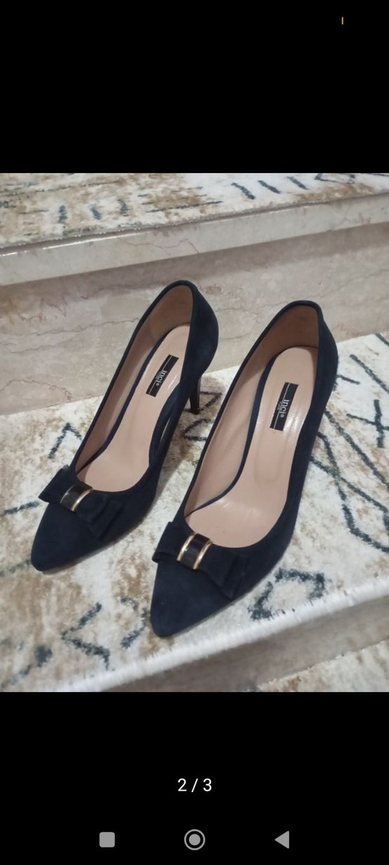 Koyu mavi süet malzemeden yapılmış, tokalı detaylı, sivri burunlu ve ince topuklu kadın stilettoları, ofis için uygun.