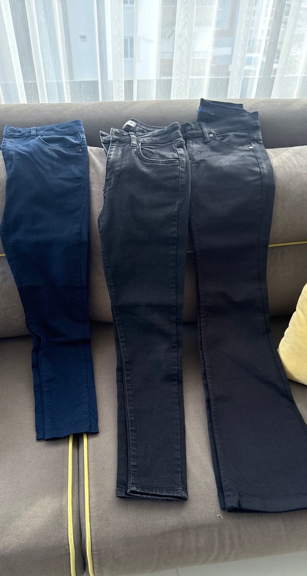 Koyu mavi ve siyah renkte, normal boyda, kemerli ve dar kesim kadın kot pantolonları. Günlük kullanıma uygundur.