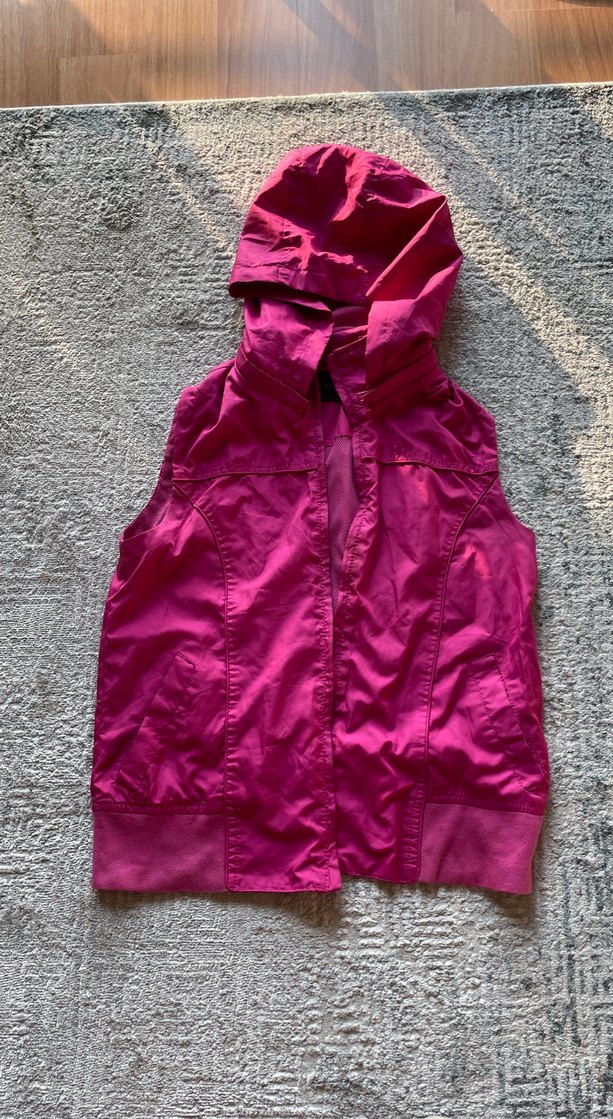 Koyu pembe renkte, kapüşonlu ve fermuarlı, sentetik kumaştan yapılmış, yüksek yakalı ve dar kesim kadın yeleği. Sokak stili ve dış mekan kullanımı için uygundur.