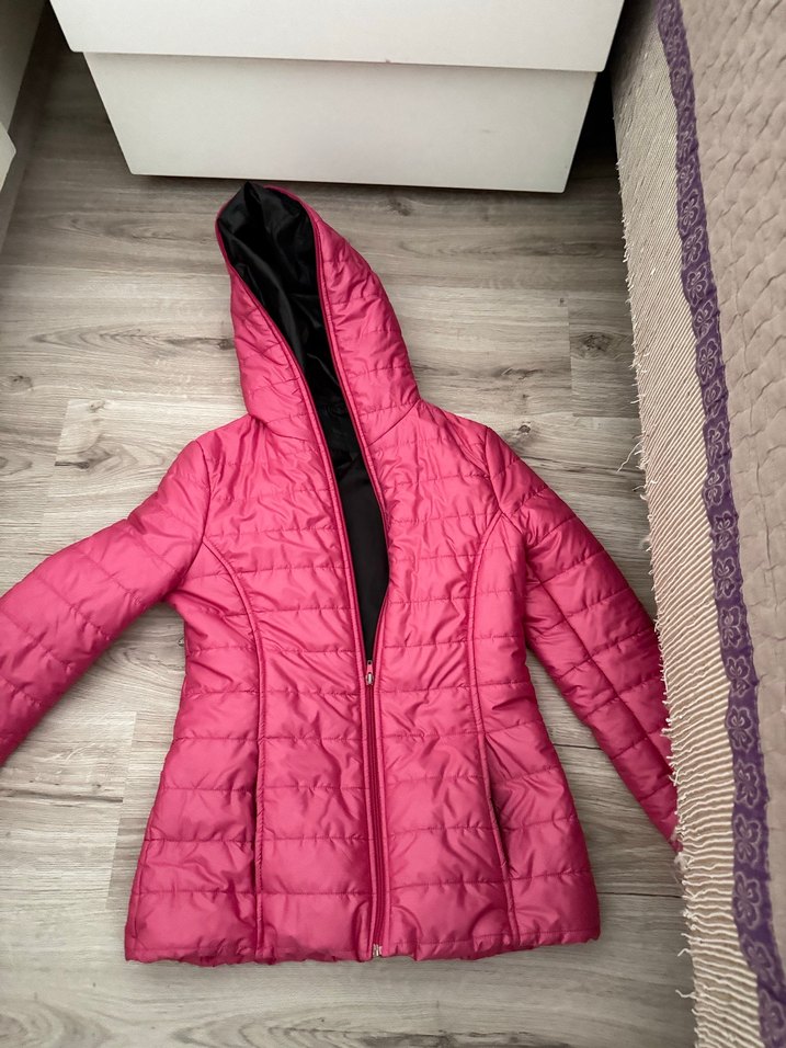 Koyu pembe renkte, kapüşonlu, fermuarlı ve uzun kollu, sentetik kumaştan kadın mont. Sokak stili için uygun, günlük kullanıma uygun rahat kesim. ❄️