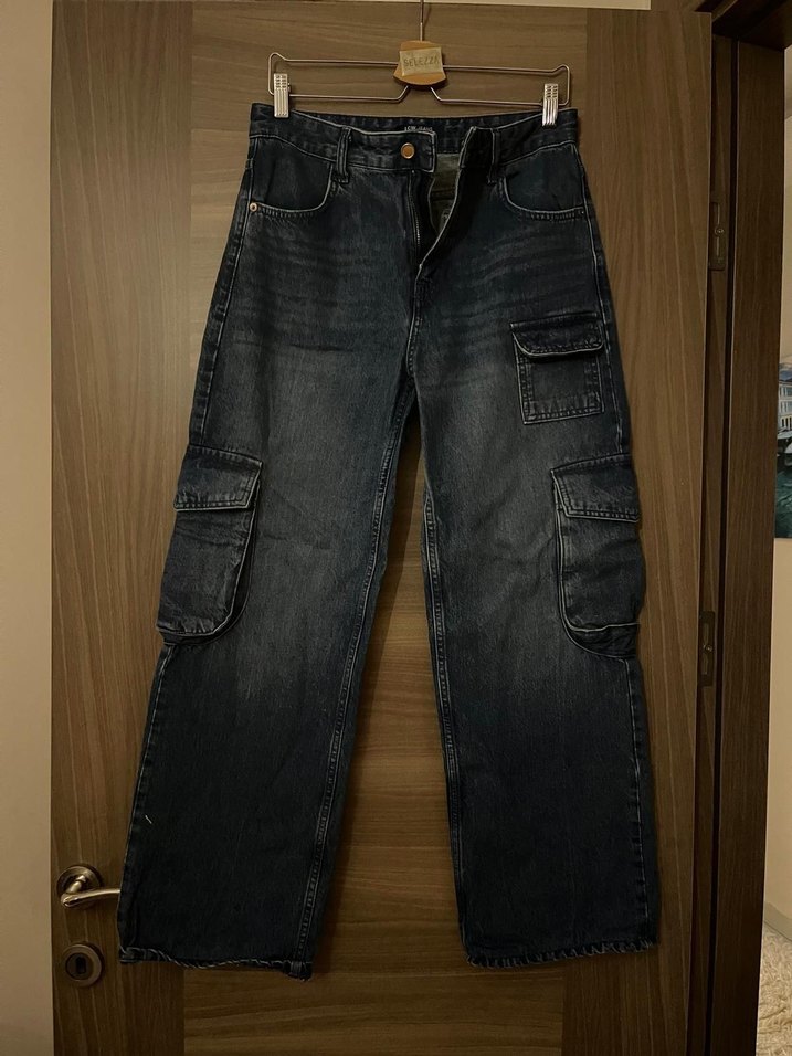Koyu renk denimden, bol kesim kadın kargo kot pantolon, çoklu cepleriyle günlük sokak stili için uygun. LC Waikiki 38 beden koyu mavi kargo bol kot pantolon