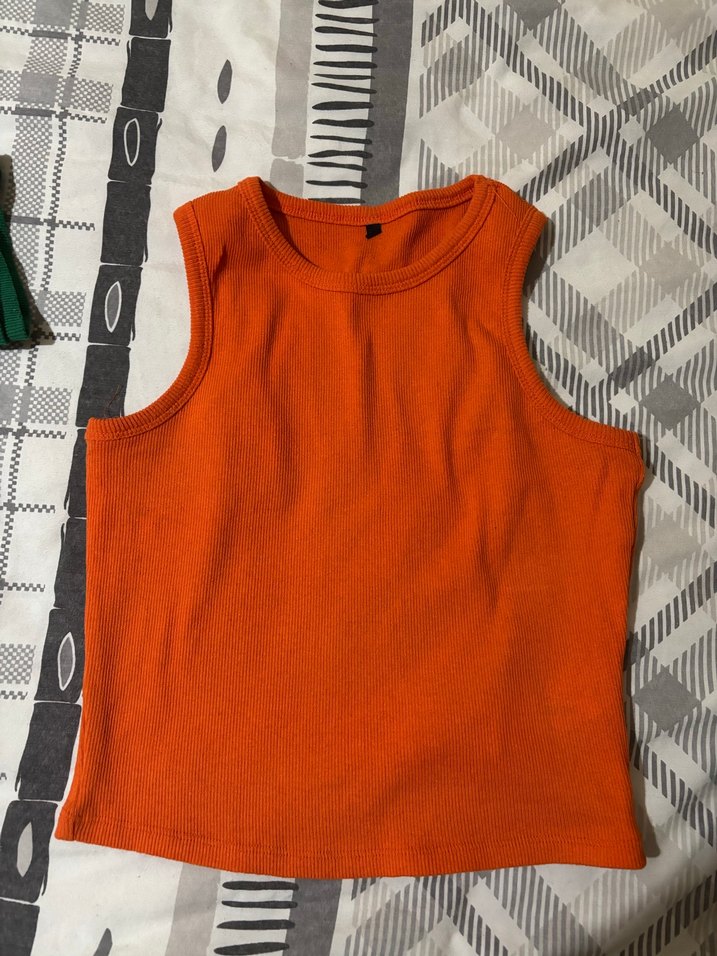 Koyu turuncu renkte, yüksek yakalı ve kolsuz, vücuda oturan kadın atlet. Sentetik kumaştan, günlük rahat athleisure tarzına uygun.