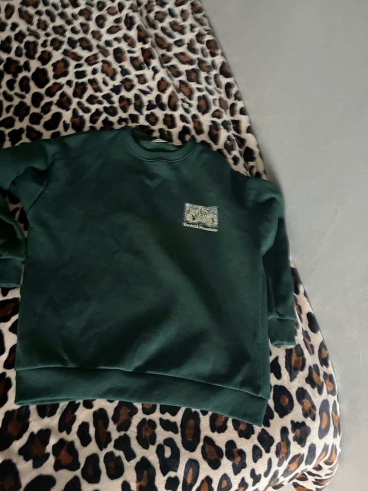Kadınlar için koyu yeşil, baskılı, uzun kollu ve yuvarlak yakalı sweatshirt. Rahat kesimi ve yumuşak, sıcak kumaşı günlük kullanım için uygun, midi boyda.
