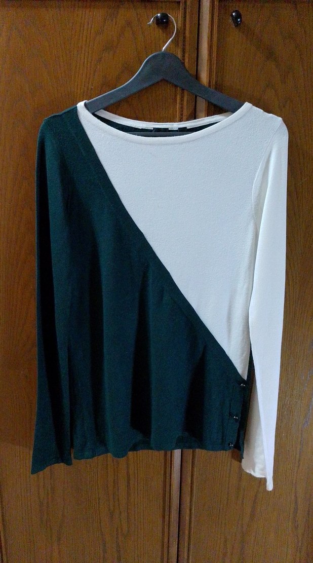 Kadınlar için yuvarlak yakalı, uzun kollu ve bol kesim pamuklu kazak. koyu yeşil beyaz renklerde düğme detaylı, günlük kullanıma uygun modern tasarım. L beden