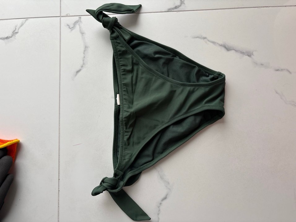 Koyu yeşil renkte, strappy detaylı ve vücuda oturan bikini altı. Plaj için sade ve şık bir modeldir. ️az ve temiz kullanıldı problemsiz kaliteli