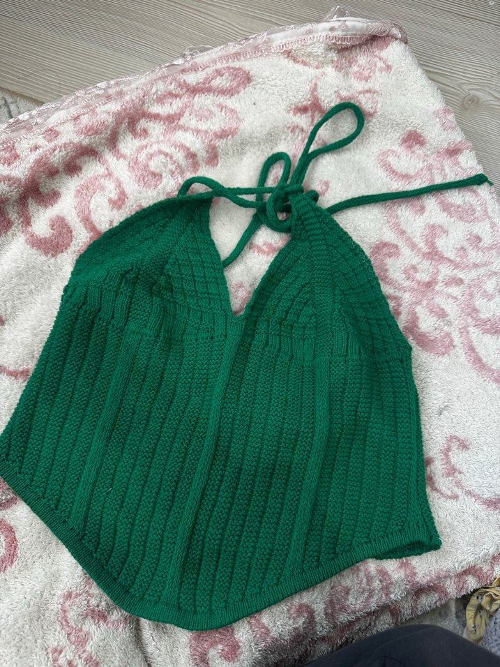 Kadınlar için koyu yeşil renkte, örgü dokulu ve kısa boyda, bohem tarzda rahat bir bralet. Boyundan bağlamalıdır.
