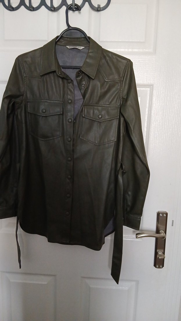 Kadın koyu yeşil deri ceke- gömlek yakalı ve uzun kollu, kemerli ve normal uzunlukta. İki ön cepli, günlük kullanıma uygun, rahat kesim.