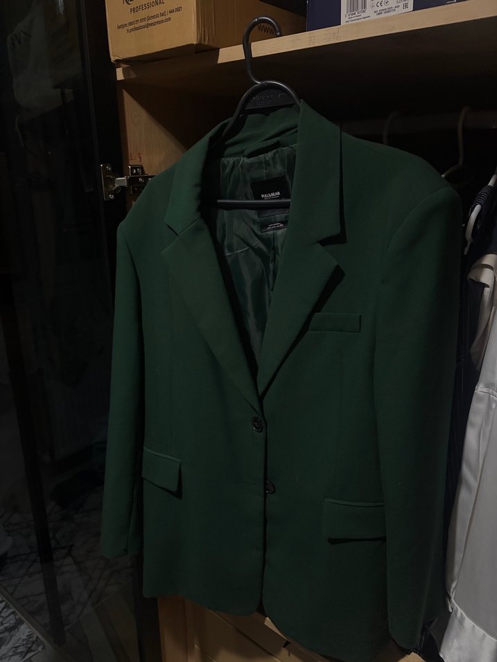 Kadınlar için koyu yeşil, düğmeli, satenimsi kumaştan yapılmış, normal boy ve regular fit blazer ceket. Ofis ve sokak stili için uygundur. Hiçbir sorunu yok