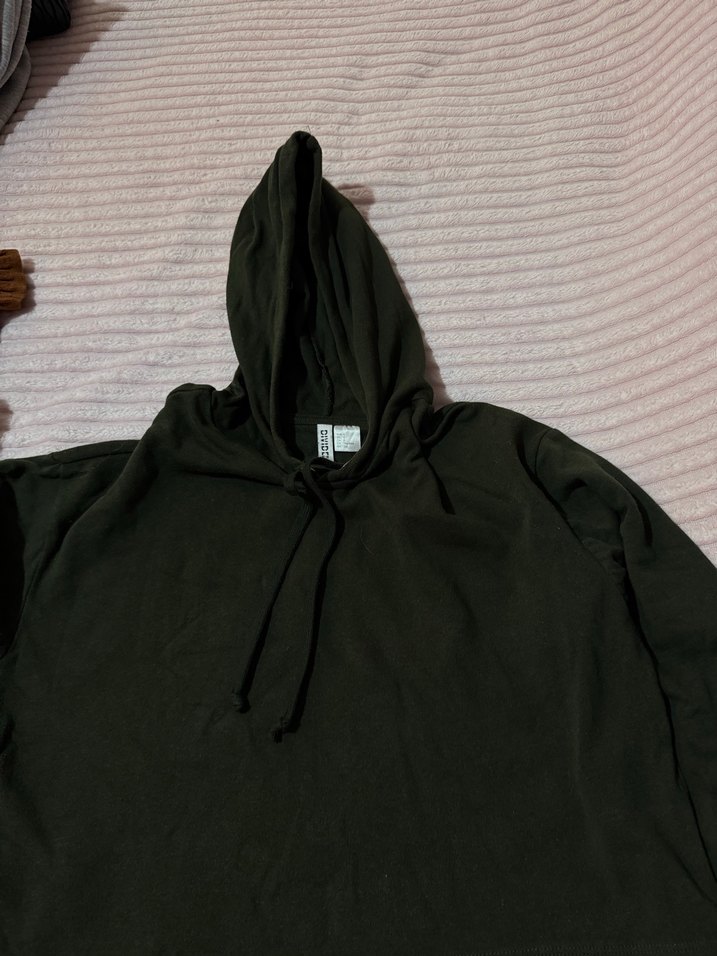 Kadın kapüşonlu, uzun kollu, koyu yeşil renkli sweatshirt. Yumuşak ve sıcak kumaştan, düz ve salaş kesim, günlük kullanıma uygun midi boyda.