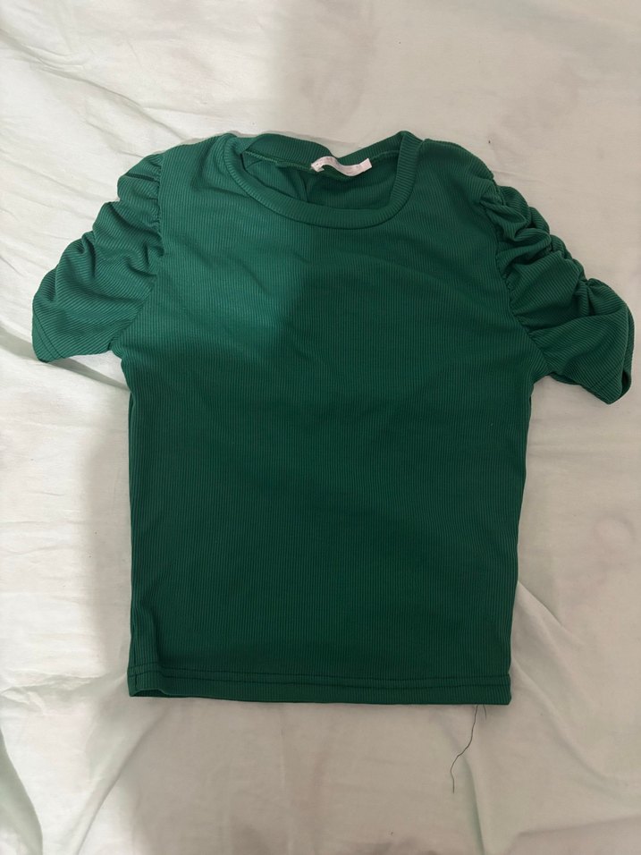 M BEDEN Koyu yeşil renkte, kısa kollu ve büzgülü detaylara sahip, dar kesim kadın ve genc kıza uygun crop. Yumuşak sentetik kumaştan üretilmiştir.