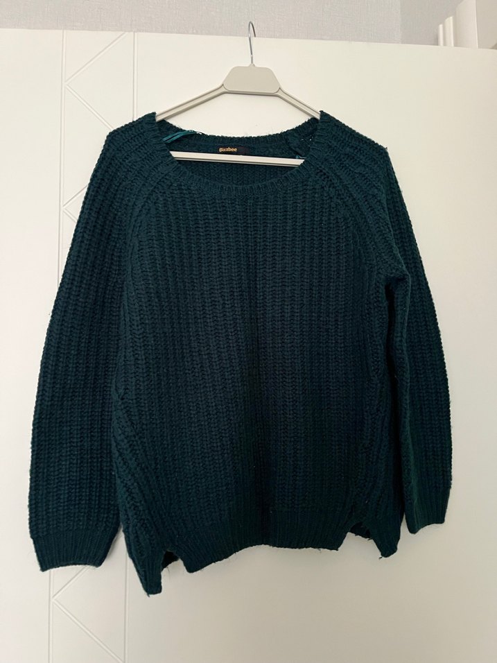 Kadınlar için koyu yeşil örgü kazak, yuvarlak yaka ve uzun kollu. Rahat kesimi ve normal midi boyuyla günlük kullanıma uygun sade ve konforlu bir model.
