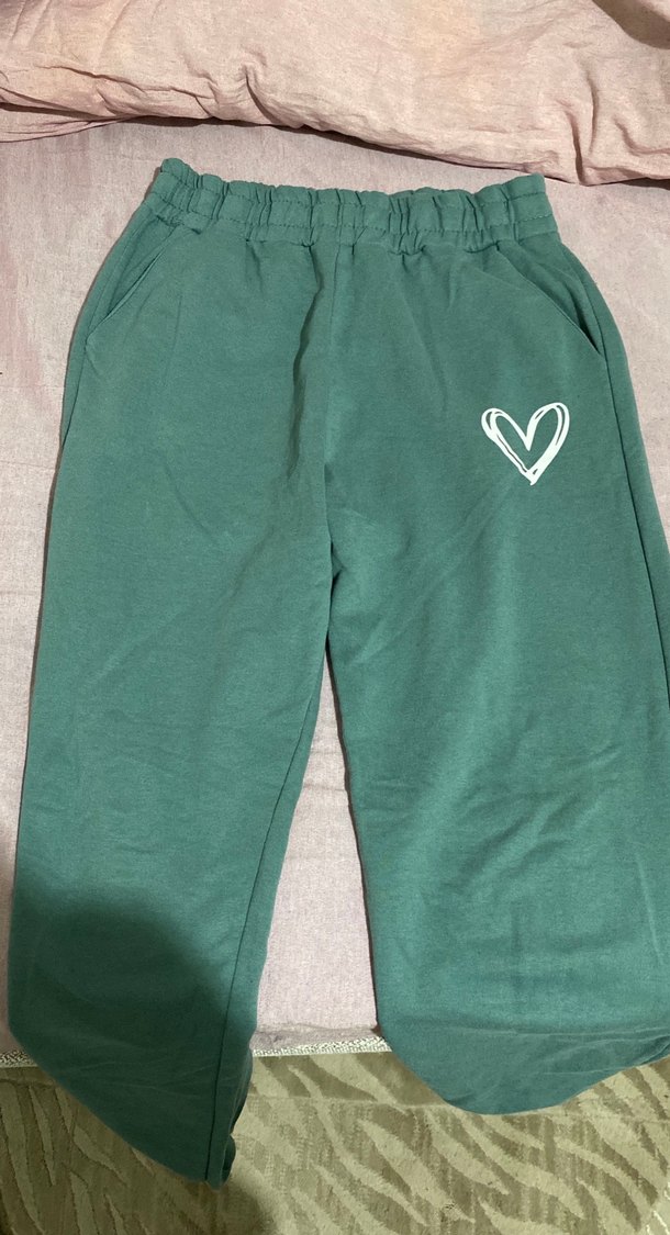 Kadınlar için koyu yeşil, pamuklu, rahat kesim ve normal boy eşofman. Yan cepler ve kalp desenli, günlük kullanıma uygun şık ve rahat bir model.