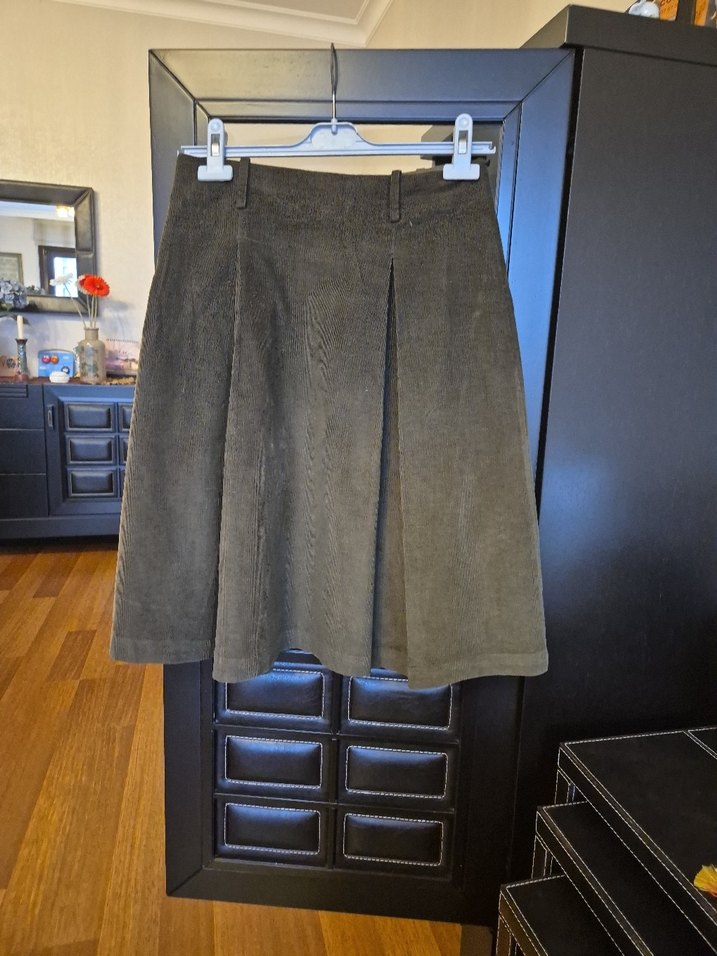 Kadın için koyu yeşil ( haki), pilili ve kloş bir etek. Sokak tarzına uygun, yumuşak dokulu. İş ortamı içğn de uygun ve şık. 34 beden. Beli 36 cm., boyu 62 cm.