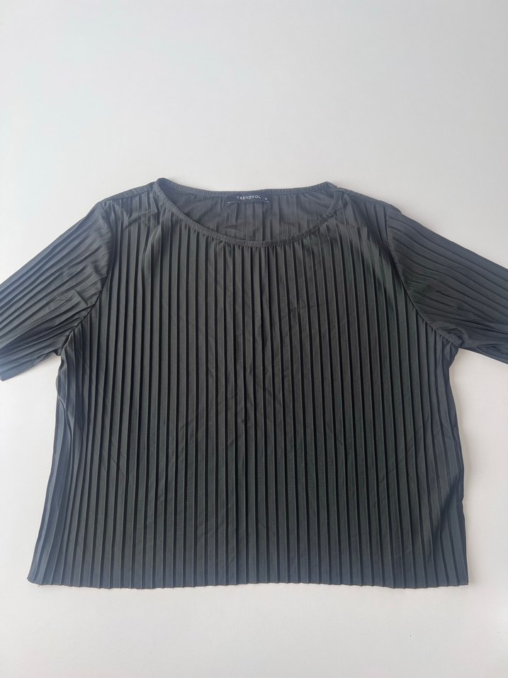 Kadın bluz, piliseli tasarımı, yuvarlak yaka ve kısa kollu. Koyu yeşil ve gri tonlarda, sentetik kumaştan, bol kesim ve normal boyda. Günlük kullanıma uygun, şık ve avant-garde tarzda.