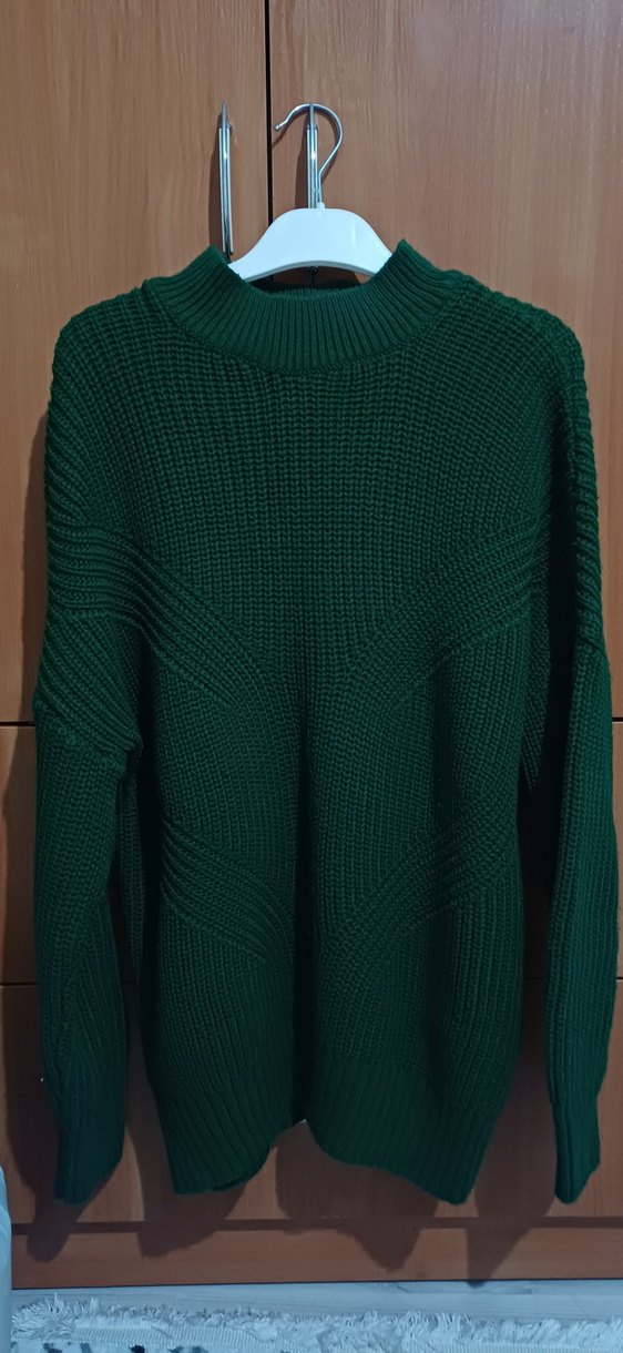Koyu yeşil renkte, uzun kollu örme triko kazak. Bol rahat bir tasarıma sahiptir.