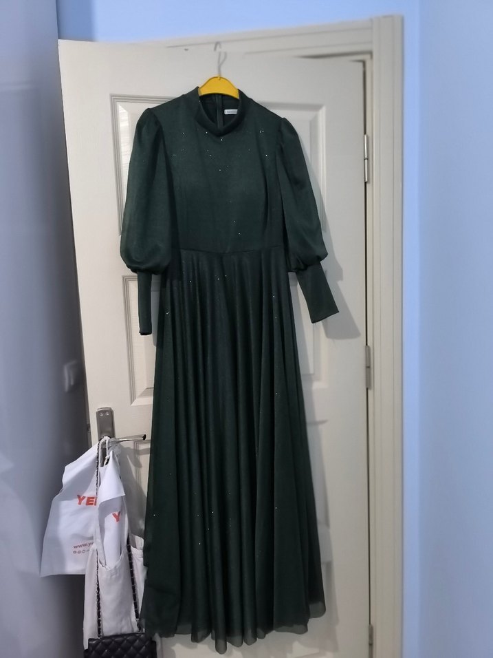 Koyu yeşil renkte, uzun kollu, yüksek yakalı ve drapeli detaylara sahip bol kesim kadın abiye elbisesi. Modern klasik tarzıyla düğünler için uygundur. 1 kere giyildi. Hiçbir defosu yoktur.